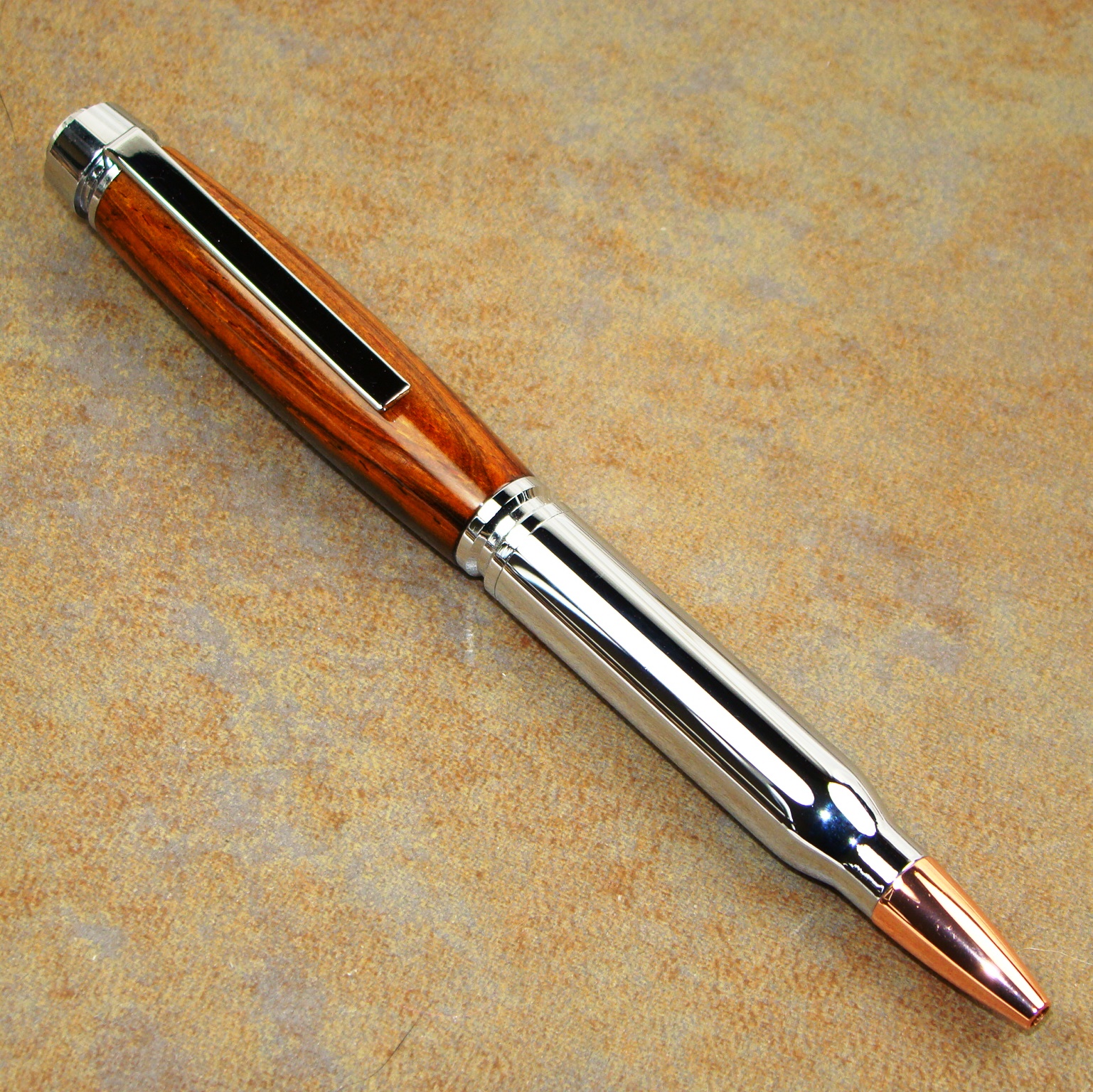 Always one of our favorite woods to turn, and this blank did not disappoint with the rich, deep colors of Cocobolo. We sure wish you could smell it turning, because it smells amazing!. Pen uses a Parker style refill.