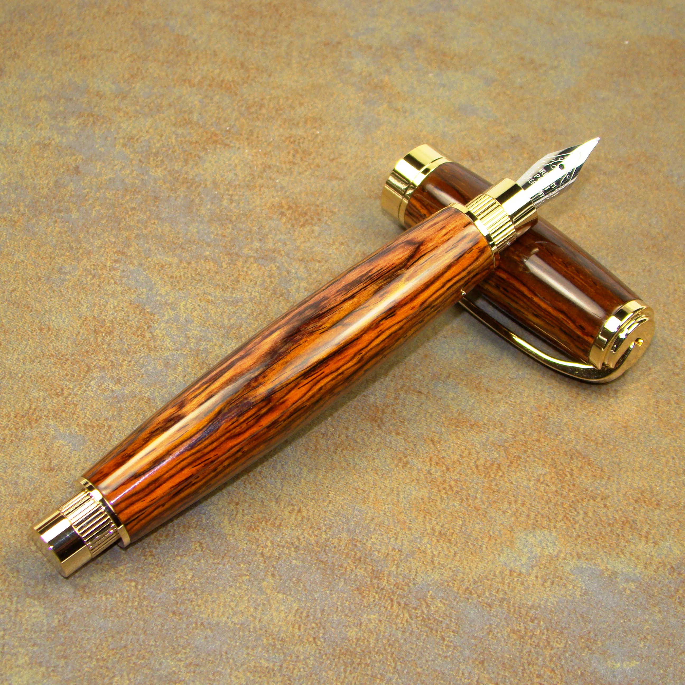 Simply elegant and beautiful selection of Cocobolo wood, with a variety of tones and hues in this amazing tropical wood. The cap on this fountain pen is magnetic and posts to both ends. Uses ink cartridge or refillable pump (included).